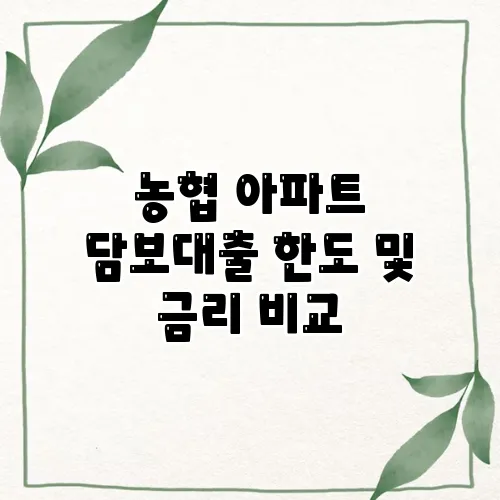 안녕하세요! 오늘은 농협 아파트 담보대출의 한도와 금리에 대해 알아보려고 합니다. 안전하고 효과적인 대출 선택이 부동산 투자에 미치는 영향은 무척 큽니다. 그래서 오늘 이 글을 통해 담보대출 한도, 금리, 대출 조건을 깊이 이해하고, 여러분에게 가장 적합한 농협 대출 상품을 비교해보는 시간을 가져보겠습니다. 은행 대출은 복잡하게 느껴질 수 있지만, 차근차근 준비하면 충분히 가능합니다. 그럼 시작해볼까요?